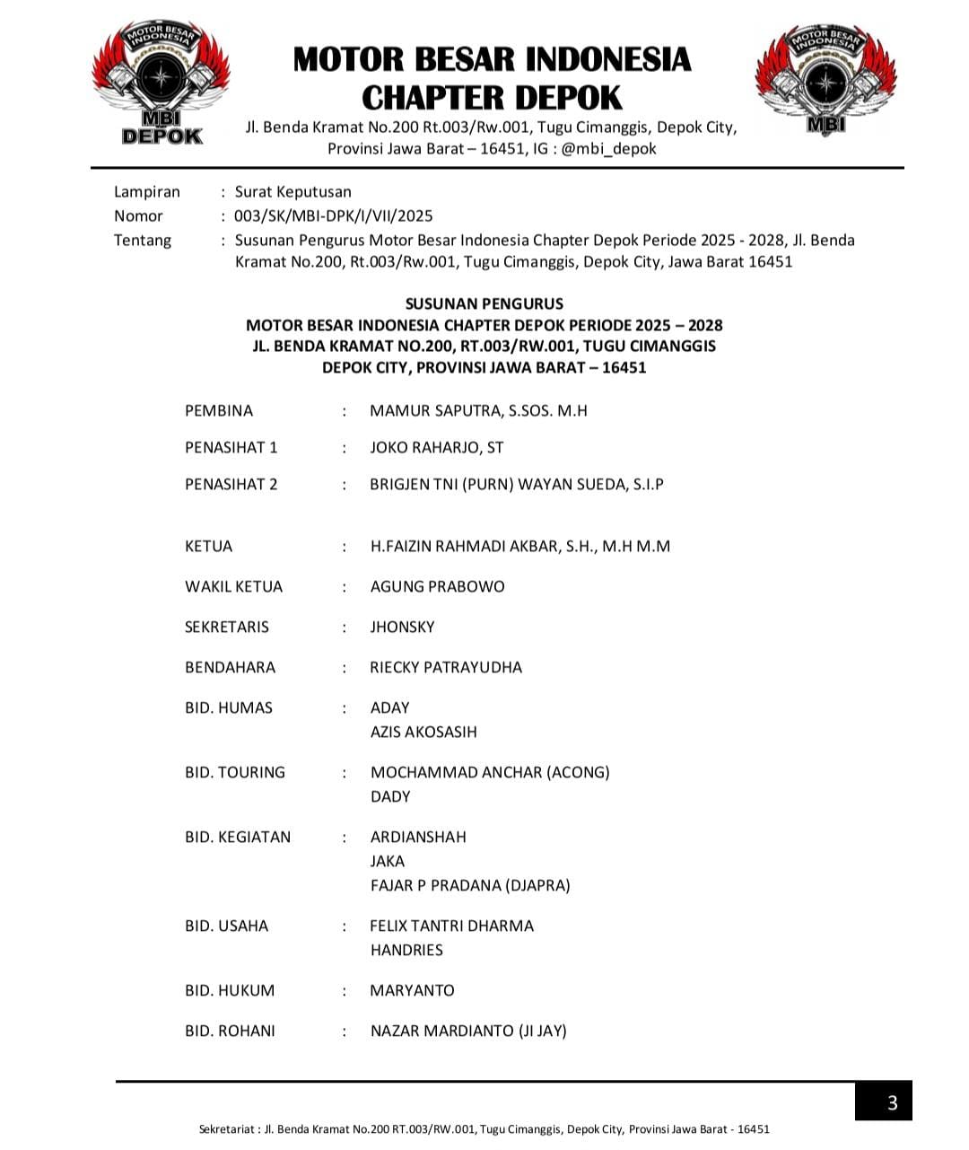 Berikut susunan pengurus MBI Chapter Depok periode 2025-2028 :